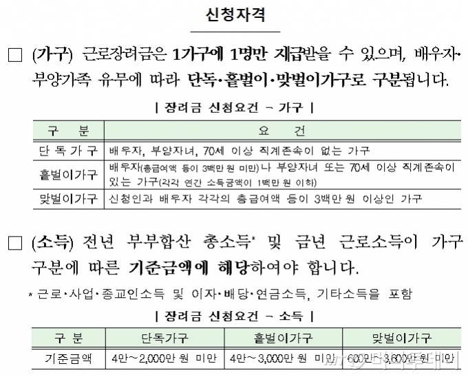 근로장려금은 신청하는 본인이 근로자이거나 자영업자로서 가구 기준과 소득 기준 그리고 재산 기준을 모두 충족해야 합니다.
